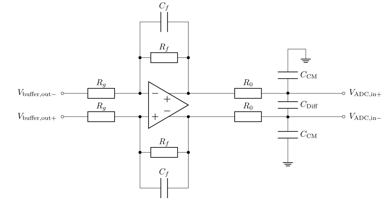 The crossover frequency \(f_\mathrm{aliasing,-3dB}\) of the anti-aliasing filter (red) is formed by the capacitors \(C_\mathrm{Diff}\) and \(C_\mathrm{CM}\). They create a first order low-pass filter with the series resistors \({R_0}\) with