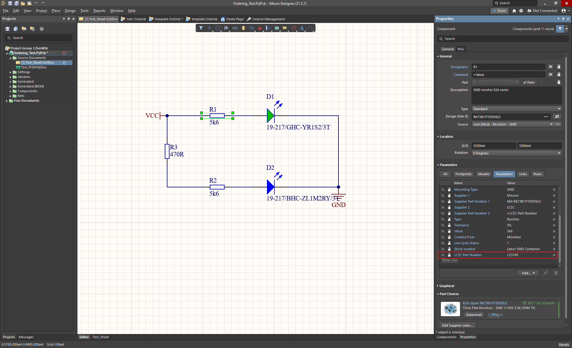 LCSC is the supplier for JLC’s component library. There, every component has a unique part number called JLCPCB Part # (formerly also LCSC Part #). This number is going to be important for the BOM, since you can only use these components for a SMT assembled PCB. Therefore, every component of the UltraZohm library has a parameter called LCSC part number that later needs do be included in the BOM.